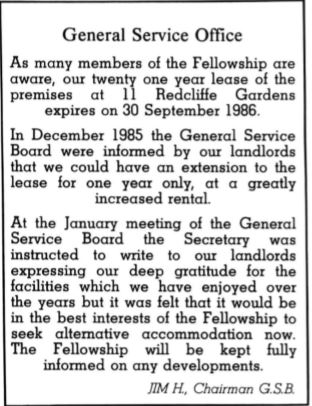 1986 – The General Service office closed its doors at Redcliffe Gardens after 21 years but stayed at the Telephone office until 1999 where it moved to Jacobs House.