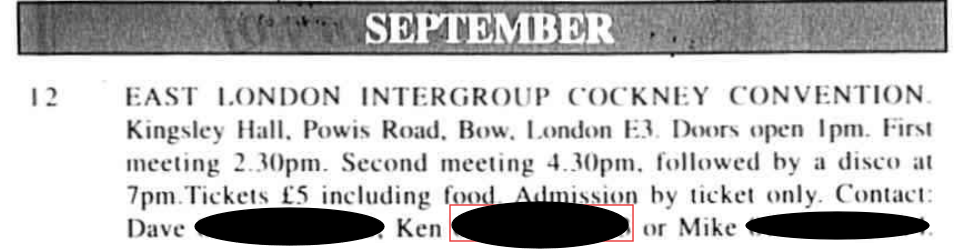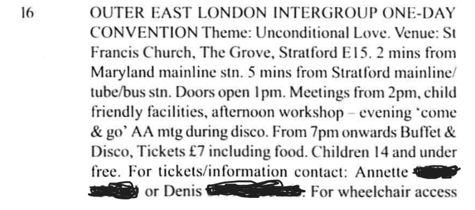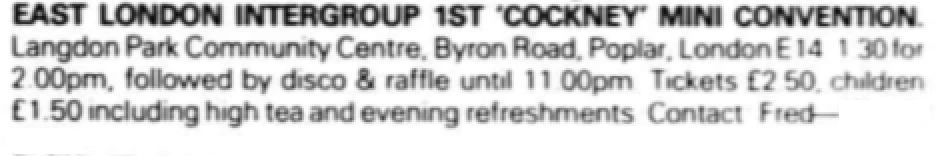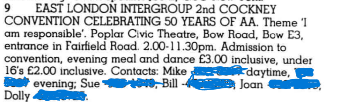 1985 – 2nd Cockney convention – theme, I am responsible – celebrating 50 years of A.A. held at Poplar Civic Theatre, Fairfield Road. 14:00 – 23:00 Admission for dance and meal £3.00 Contacts – Mike, Joan, Dolly and Bill.
