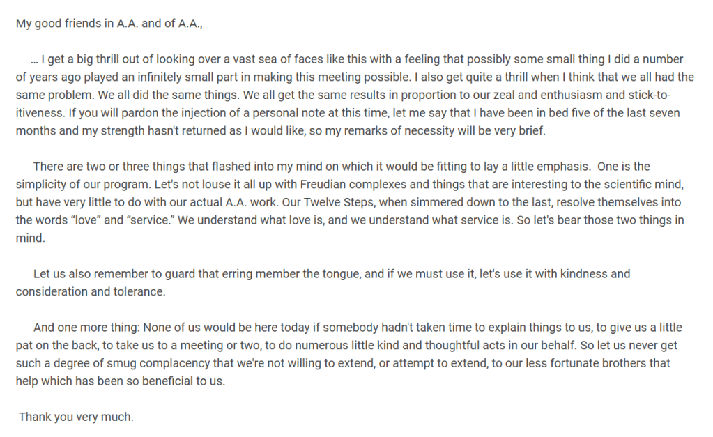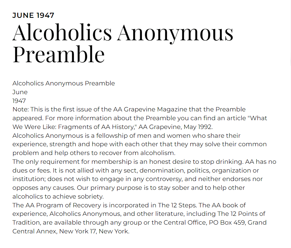1947 – The A.A. preamble was created by The Grapevine magazine and approved by Bill W. Below is a snippet regarding its creation.