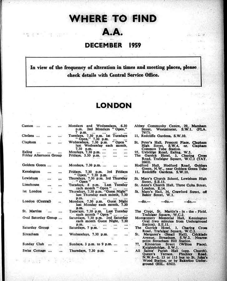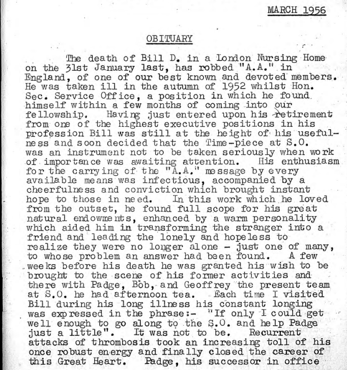 1956 – Bill D the Secretary of the London office passed way from along illness. Took on the mantle when he arrived in A.A in 1952 and his experience helped nurture newcomers.