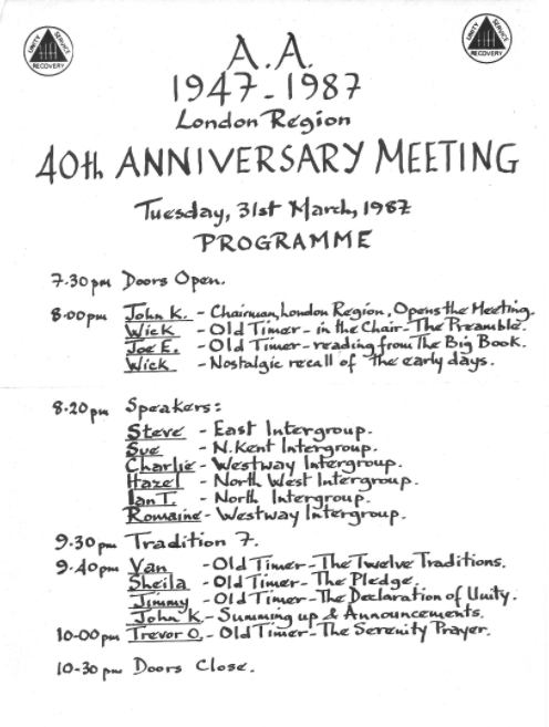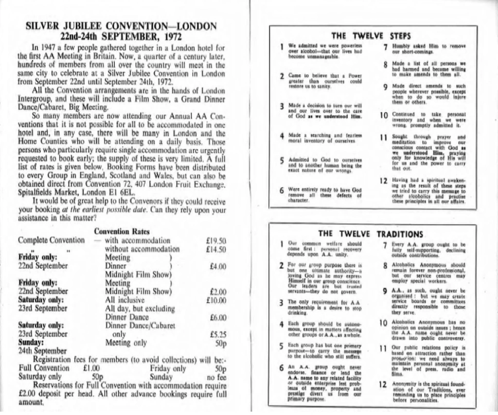 1972 – members of the Toynbee Hall group arranged the 25th anniversary of Alcoholics Anonymous in the U.K.