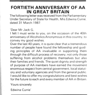 1987 – A letter to A.A from the Secretary of State congratulating on 40 years of AA in Great Britain.
