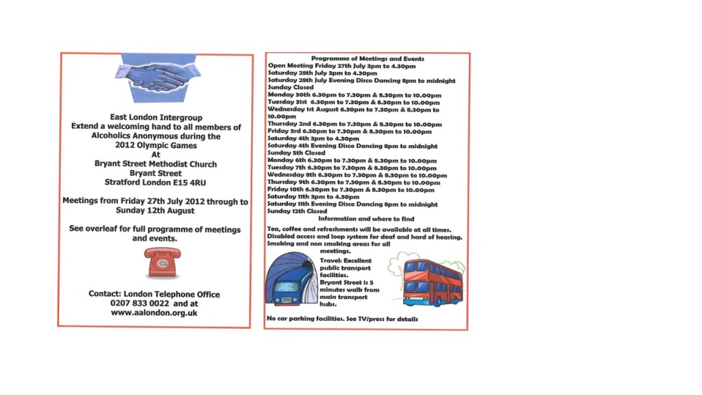 2012 – Olympics came to Stratford and East London Intergroup opened the doors of every day meetings between 27th July 2012 to Sunday 12th August. Held at Bryant Street.