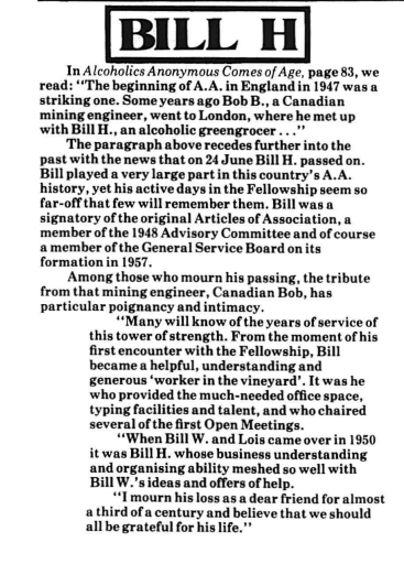 1978 – June, Bill H the alcoholic greengrocer, passed away. Bill H lent his office to be the first AA helpline, also was part of the general service board on its creation in 1957.