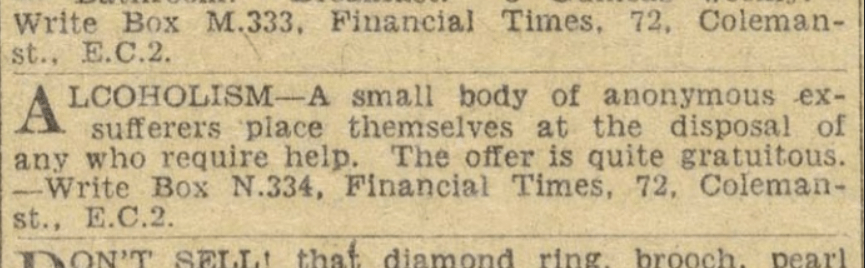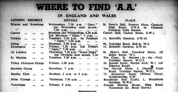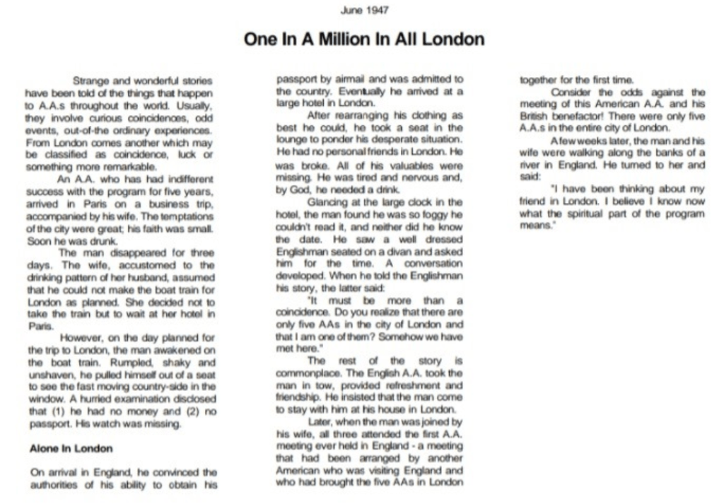 In the Grapevine at the end of 1947, Ward W tells his story of being at the first recorded AA meeting in London.