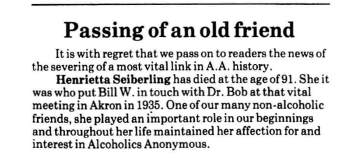 1979 – December 5th – Henrietta Seiberling passed away. The lady who Introduced Dr Bob to Bill W.
