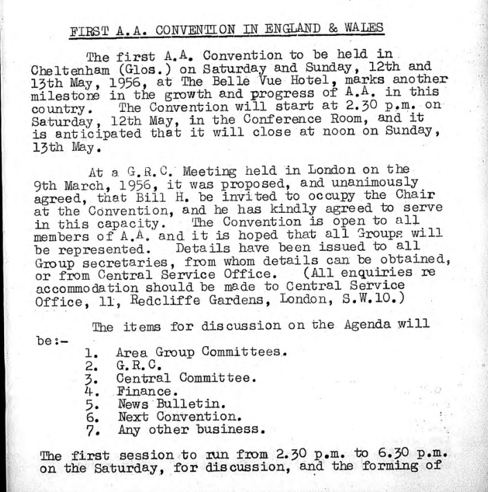 1955 – General Service Office was created – telephone line transferred to Redcliffe Gardens from Bill and Ronald H’s office. Bill H and Alan B were instrumental at creating this.
