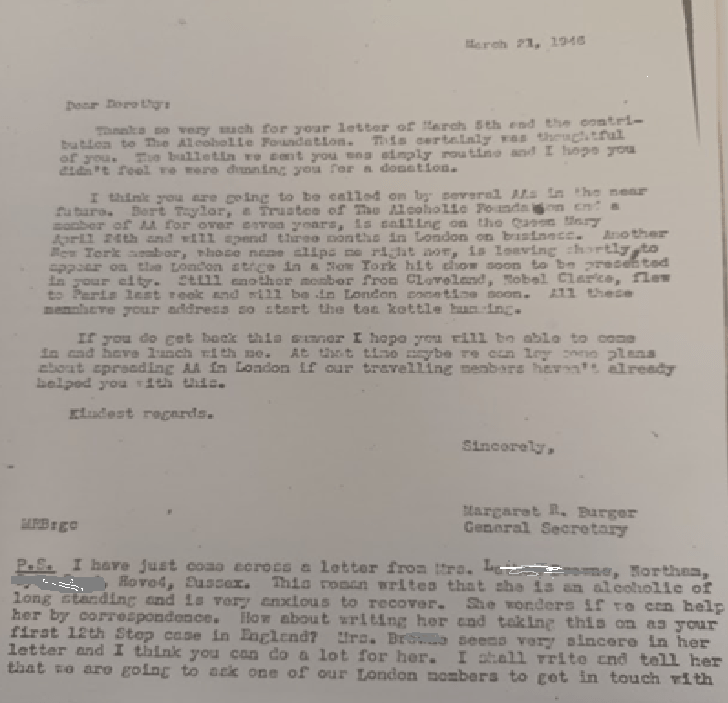 1946 – Bobbie Burger sends Dorothy H-E the London A.A contact the first official 12 step call. Chris L-B of Hove.