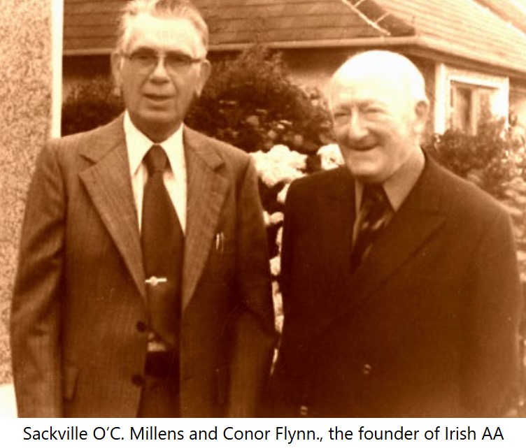 1946 – November the first meeting in Ireland happened. Conor F had gotten sober in Philadelphia and travelled back to Dublin to begin the fellowship there. The picture below shows Conor F (wth glasses) and Sackville who helped grow the fellowship in Ireland.