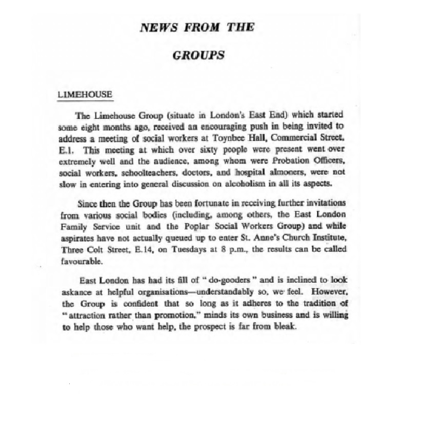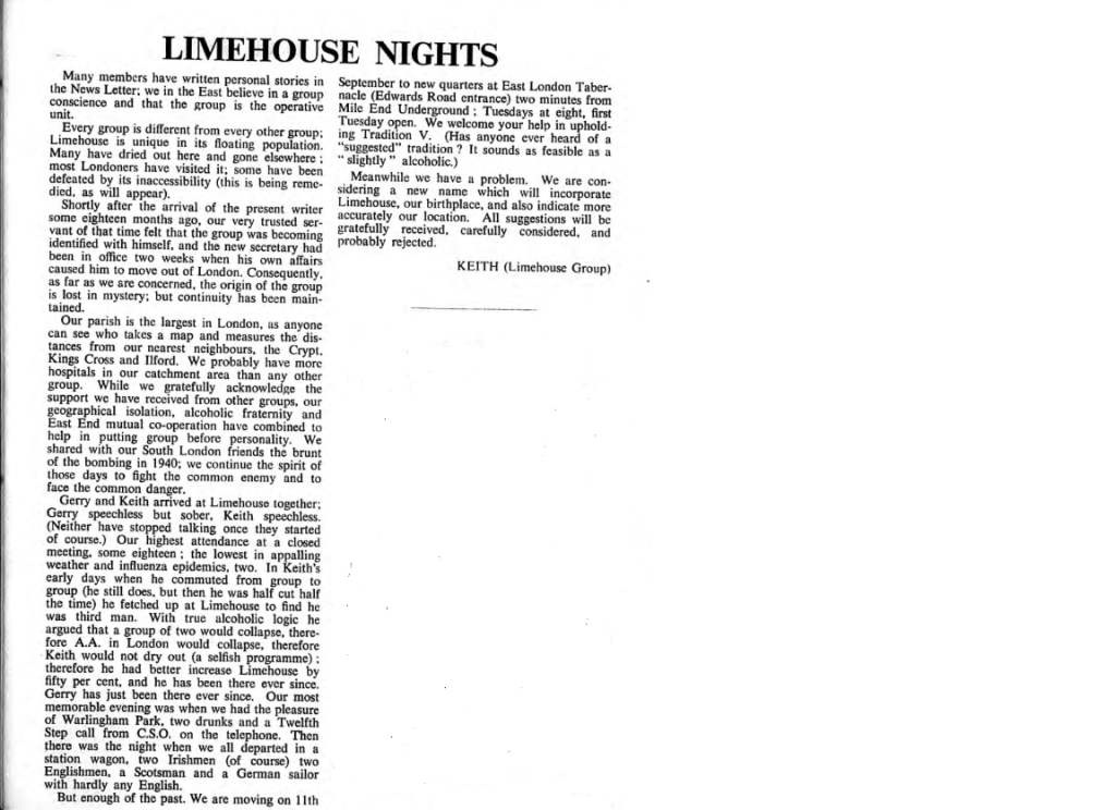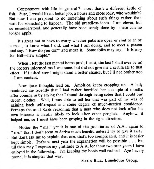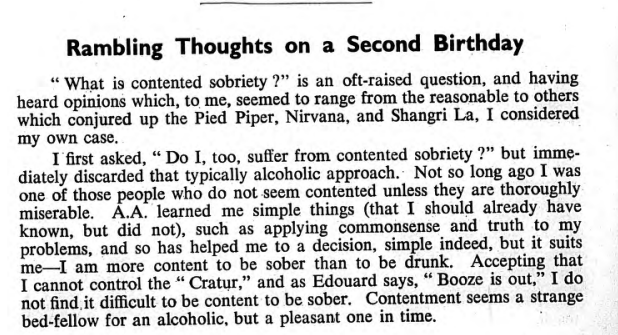 1959 – Member of the Limehouse Group, Scot Bill, spoke of his experience of Contented sobriety.