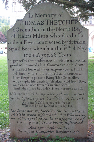 Below is the gravestone on Thomas Thetcher a Grenadier in the North Regiment of the Hants Milita. This features in Bill’s Story on his visit to Winchester Cathedral. Here sleeps in peace a Hampshire Grenadier, who caught his death by drinking cold small Beer, Soldiers be wise from his untimely fall and when ye’re hot drink Strong or none at all. An Honest Soldier never is forgot